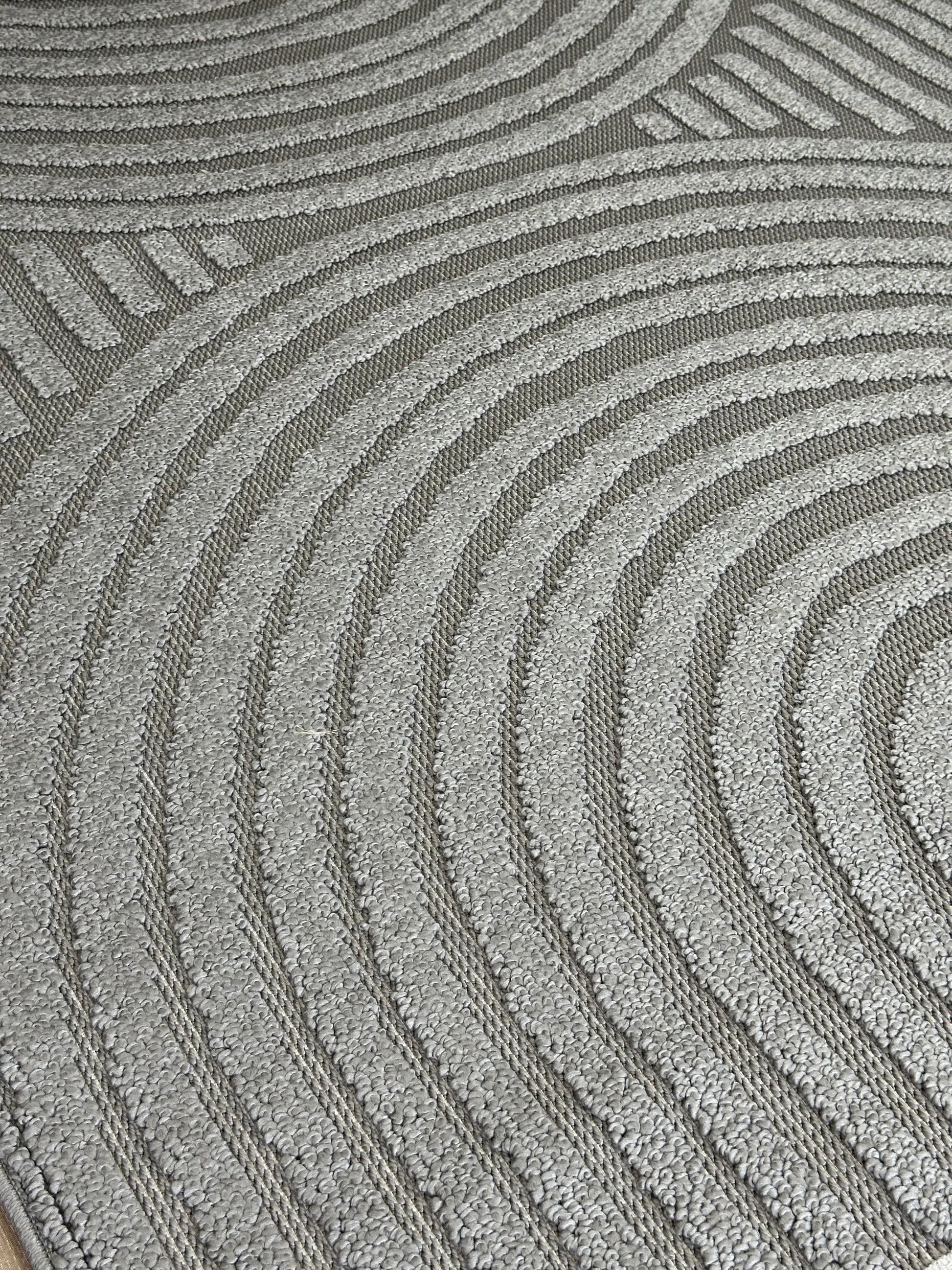 This area rug features a soft, muted grey color with a smooth texture. Its design consists of concentric circular patterns that create a subtle yet dynamic look. The fringed edges offer an extra detail, perfect for complementing contemporary and modern interiors. This rug would fit well in living rooms, bedrooms, or even offices, bringing comfort and style.