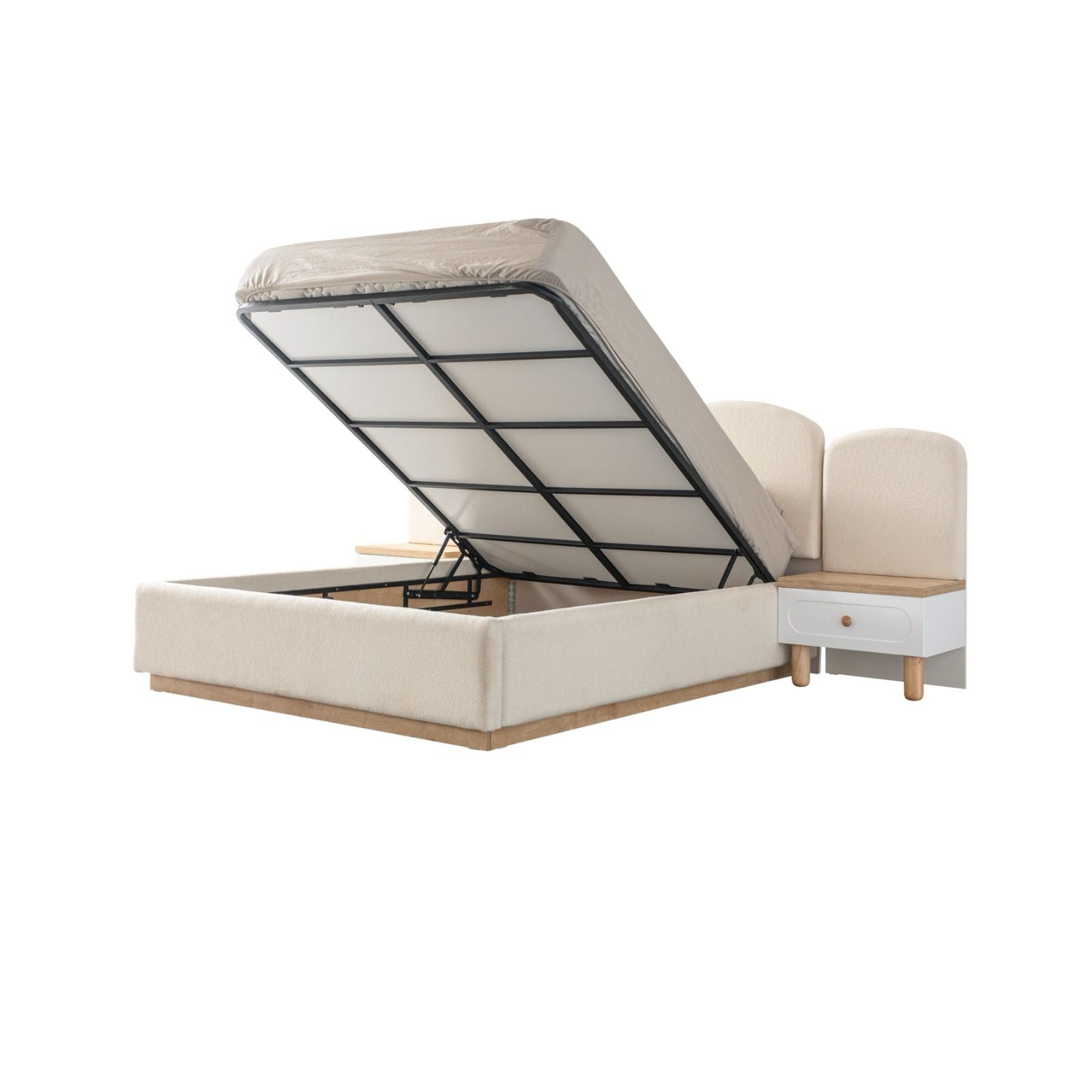 The base features a spacious storage area underneath, ideal for keeping all your essentials neatly organized. Whether it's extra pillows or personal items, everything you need is right at your fingertips!