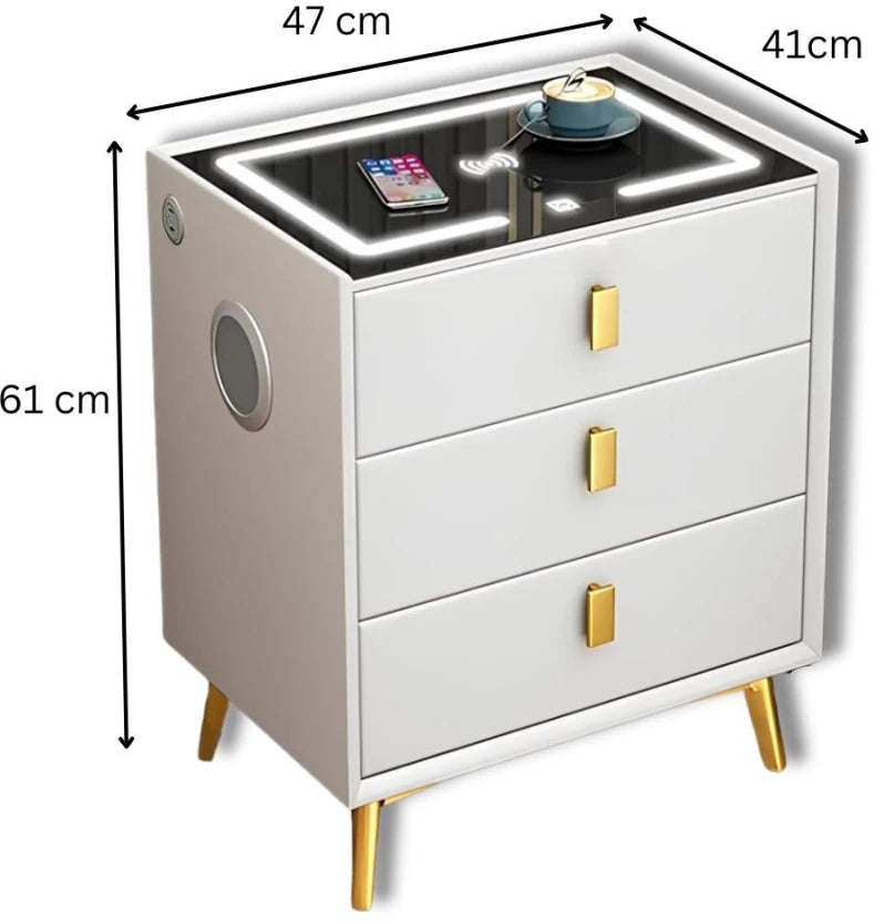 Upgrade your bedroom or living space with this stylish and functional pedestal. Designed with a sleek gray and gold finish, it features built-in wireless charging for your smartphone and devices, keeping your essentials powered up effortlessly.