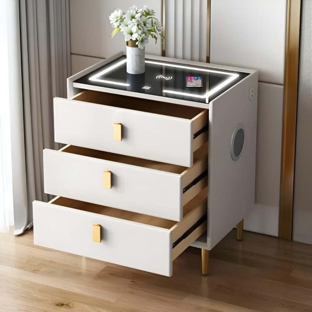 Upgrade your bedroom or living space with this stylish and functional pedestal. Designed with a sleek white and gold finish, it features built-in wireless charging for your smartphone and devices, keeping your essentials powered up effortlessly.